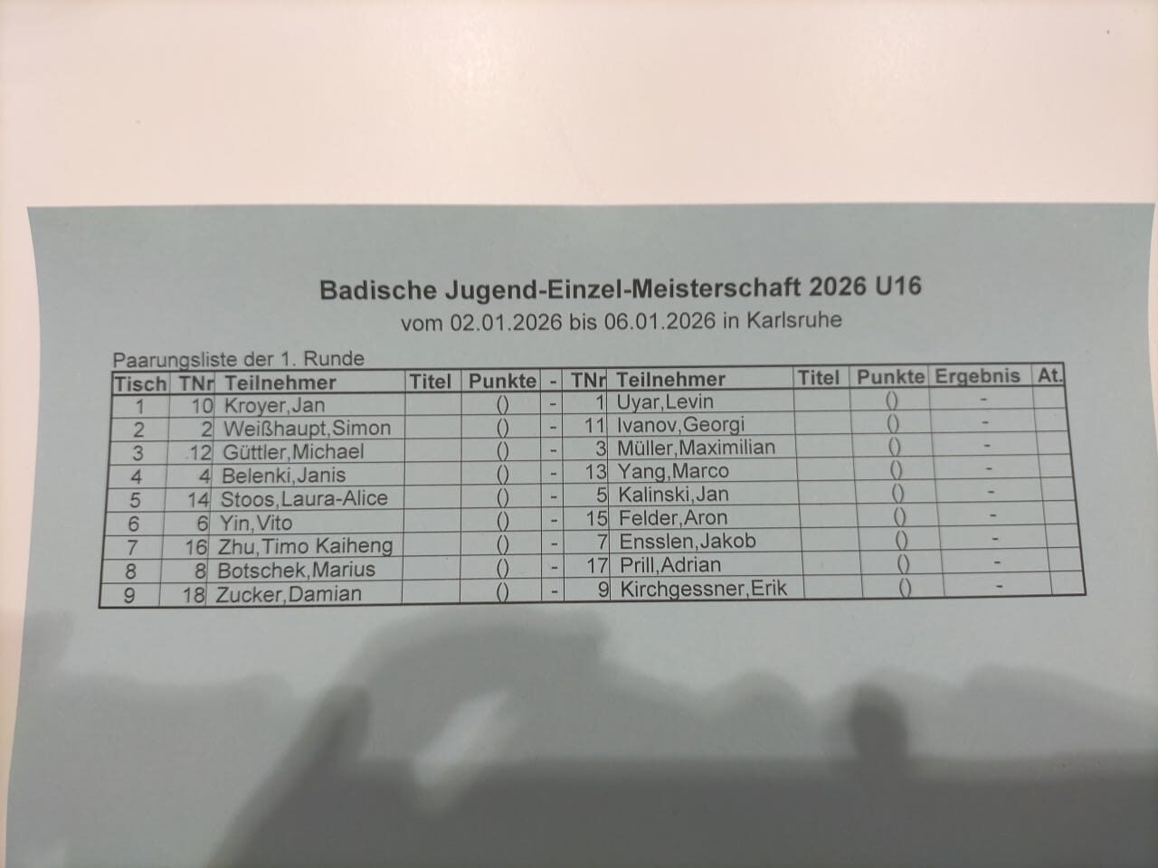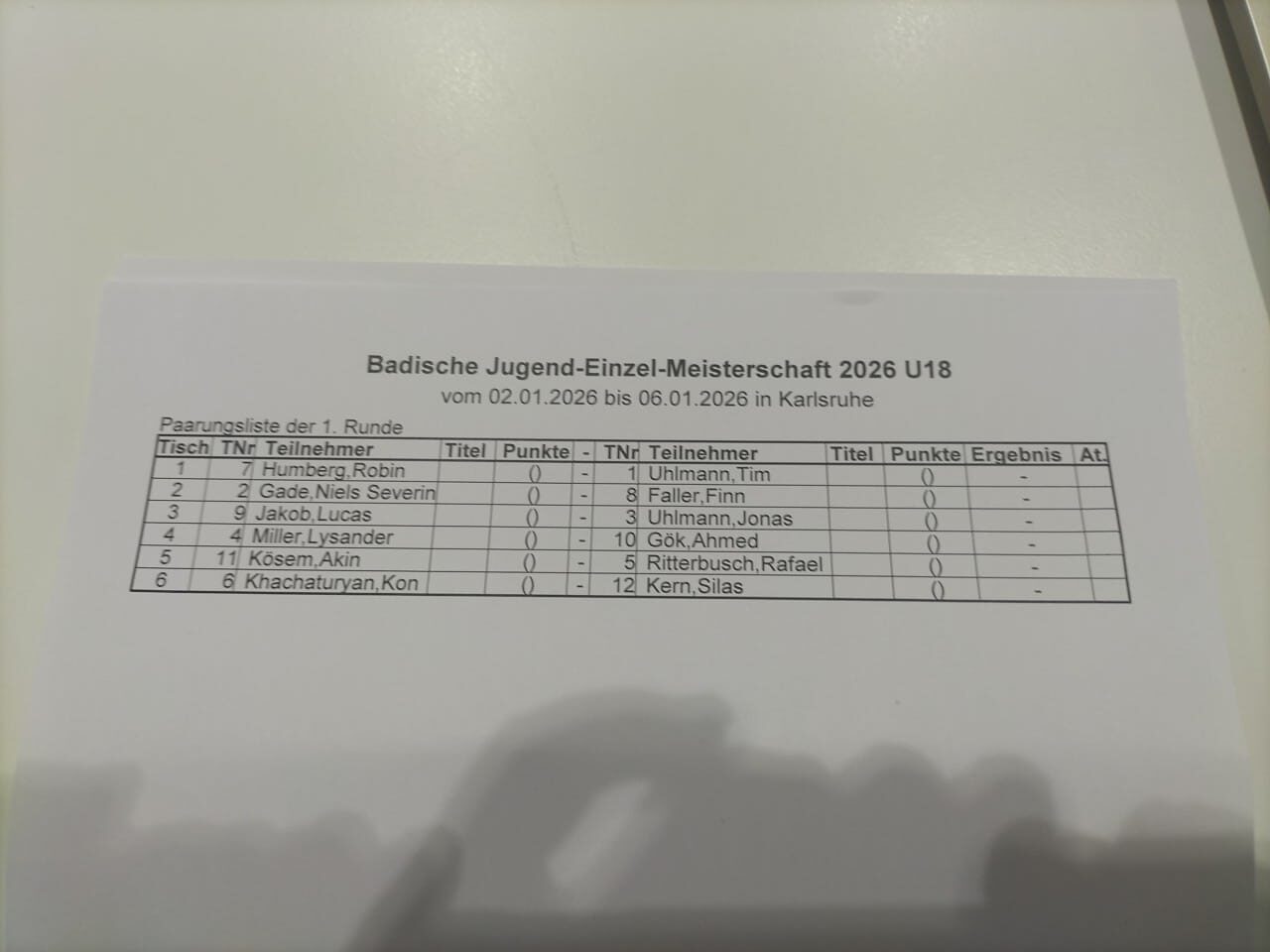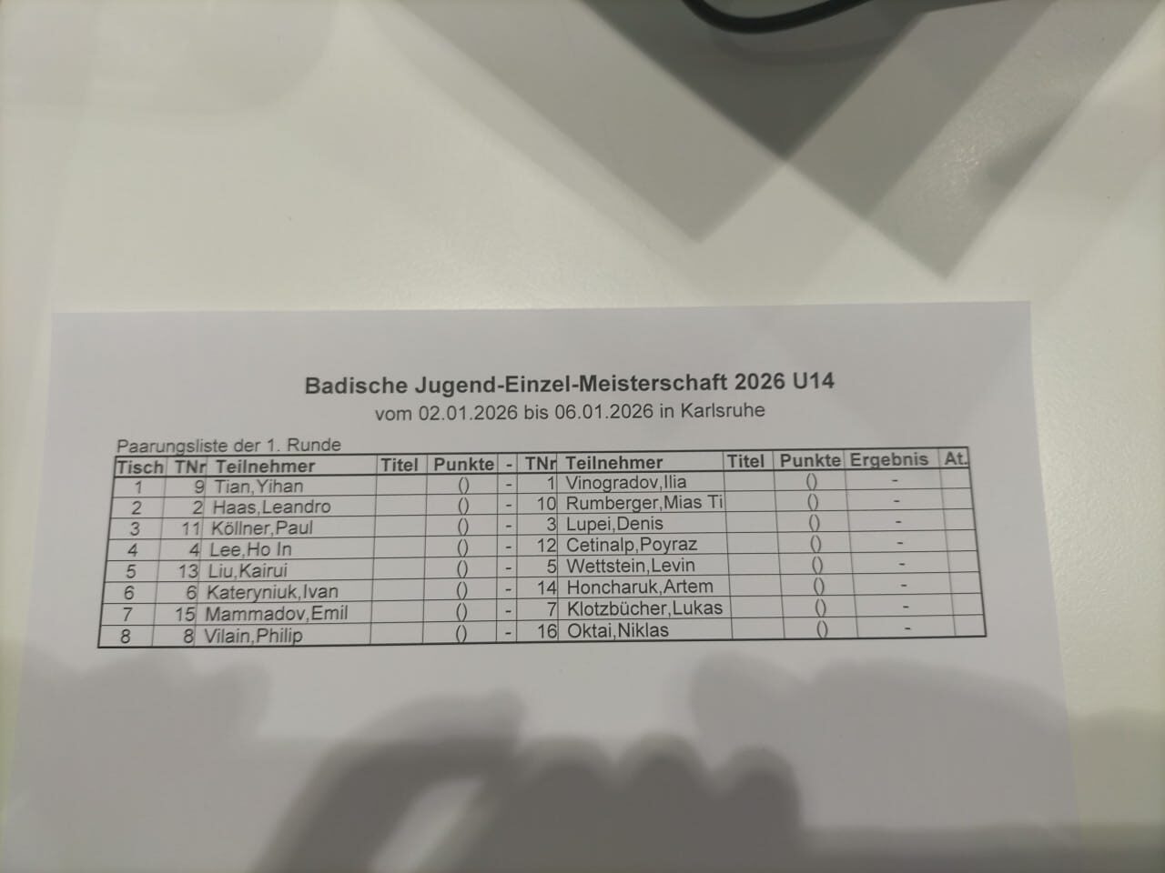 14:14 Wenigstens sind jetzt Bilder der Auslosungen aus dem Spielsaal unten da. Die Auslosung der U25 habe ich hier unten leider nicht.