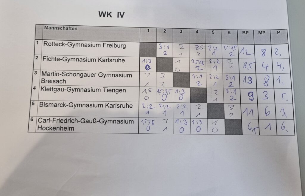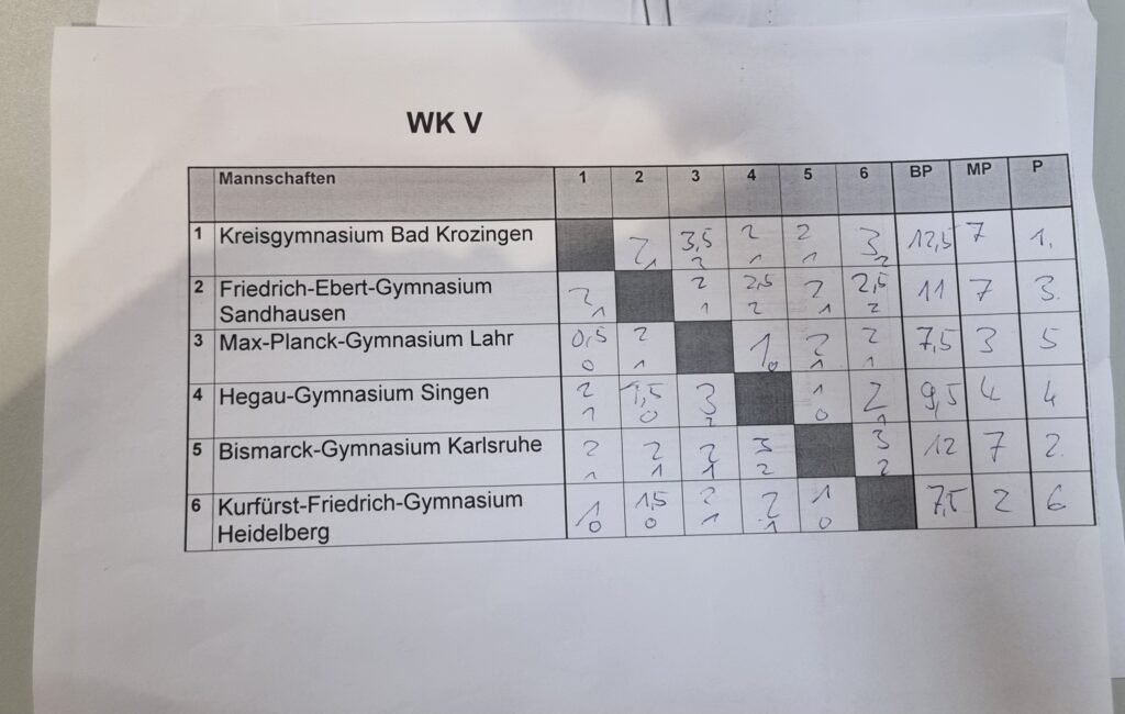 Besonders spannend ging es in der WK V zu. Hier mussten die Brettpunkte über den Titel entscheiden, da am Ende gleich drei Teams auf sieben Mannschaftspunkte kamen – so eng war es in keiner anderen Altersklasse. Die meisten Brettpunkte sammelte das Kreisgymnasium Bad Krozingen und sicherte sich damit den Titel. Platz zwei belegte das Bismarck-Gymnasium Karlsruhe, Dritter wurde das Friedrich-Ebert-Gymnasium Sandhausen.