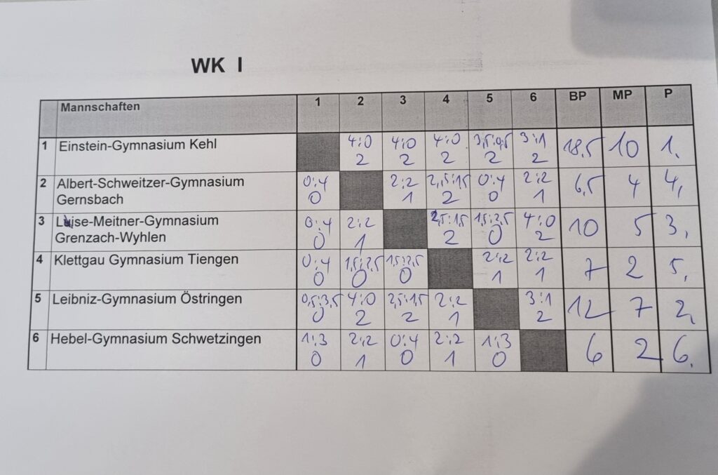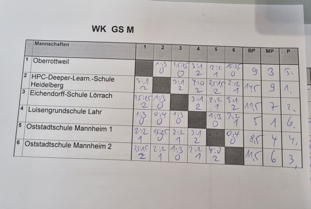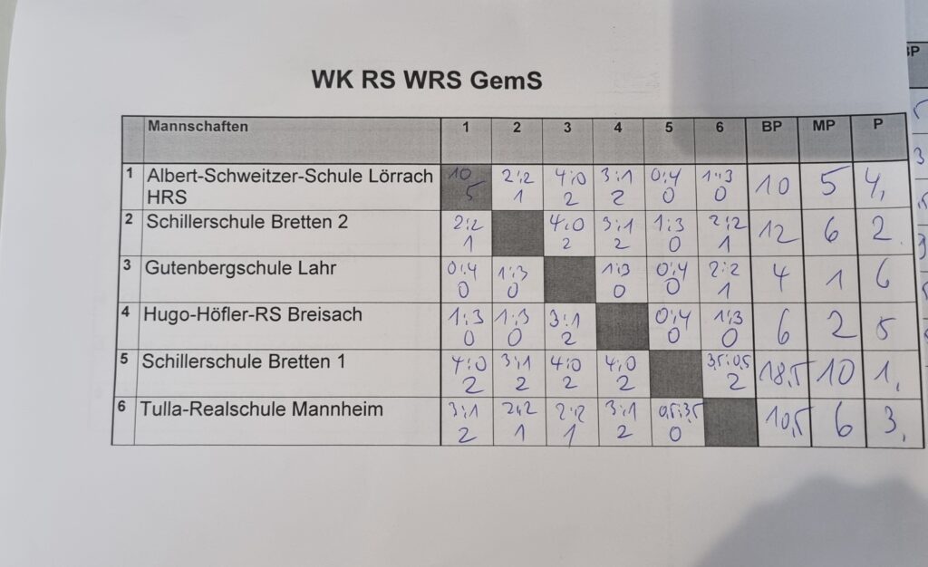 Die WK RS/WRS/GMS wurde erneut von der Schillerschule Bretten dominiert. Dass die erste Mannschaft alle Spiele gewann, war durchaus zu erwarten. Besonders bemerkenswert ist jedoch, dass die zweite Mannschaft erneut direkt dahinter Platz zwei belegte – ein Kunststück, das den Brettenern bereits im vergangenen Jahr gelungen war. Dieser erneute Doppelsieg unterstreicht die hervorragende Arbeit von Pavel Rosenblum in den letzten Jahren.