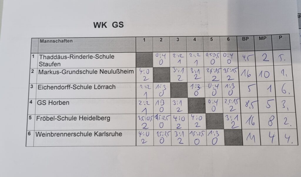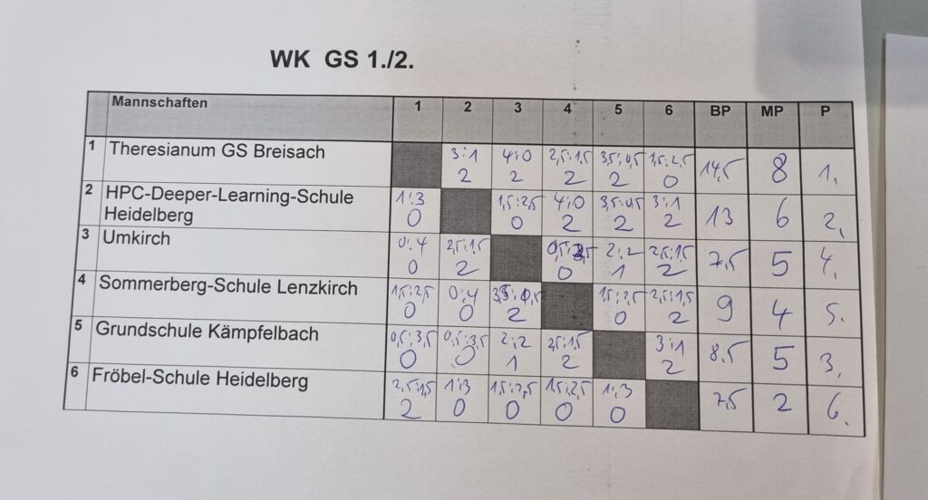 Auch die jüngsten Spielerinnen und Spieler der Klassen 1 und 2 ermittelten ihren badischen Meister. Die Tabelle zeigte, wie schwankend die Leistungen in dieser Altersklasse noch sein können: In der ersten Runde besiegte der spätere Sechstplatzierte noch den späteren Meister. Die Breisacher ließen sich davon jedoch nicht beirren und gewannen anschließend alle weiteren Runden souverän. Platz zwei belegte die HPC Deeper Learning Schule Heidelberg, Platz drei ging an die Grundschule Kämpfelbach.